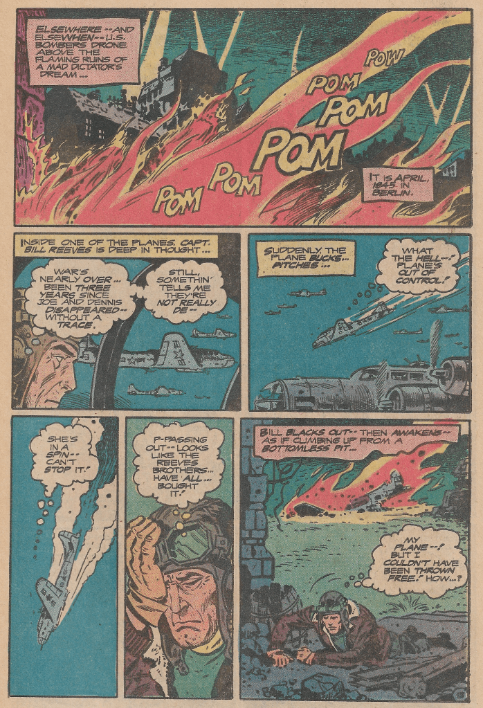 The last entry into this macabre trio of stories shows Bill Reeves, as he’s flying a fighter plane, but gets shot down. Somehow he’s thrown from the plane before impact (or was he?), and awakens near a Nazi bunker. He proceeds inside after seeing two guards dead by the entrance. Once inside, he peeks around a corner to see Uncle Adolph himself spouting orders to two of his hierarchy. After an aftershock (from a bomb?), Bill boogies out of the room, and heads to a lower level where Hitler is convening with the/a beast! Somehow, all three brothers end up at this place, and the three separate beasts combine into one, and it’s up to these three soldiers to get the job done!