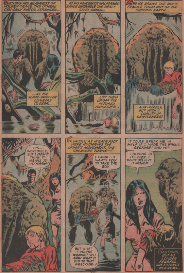 Another story of note concerning the Man-Thing, is “Night of the Laughing Dead” (issues 5 and 6 of his own volume one series). The story is pretty deep and focuses on subjects ranging from religion to parental neglect and abuse. Again, heavy subjects, but Gerber uses a Swamp Monster, hippies, and circus performers to tell this must-read story. Steve even wrote himself into a Man-Thing story (Man-Thing 22, volume 1), and it was glorious (image below)!