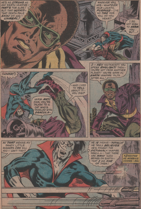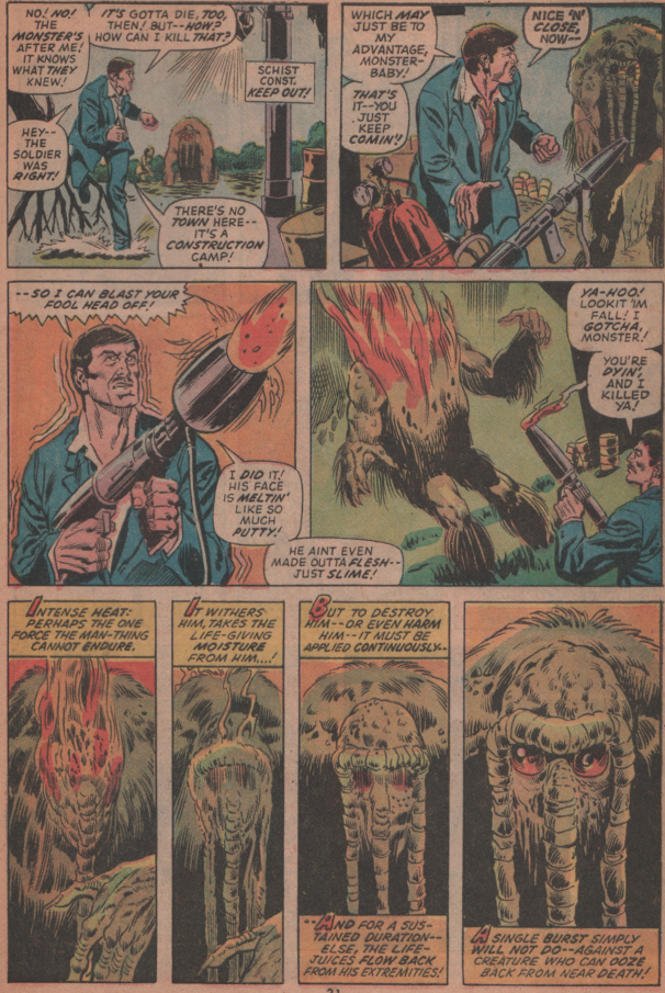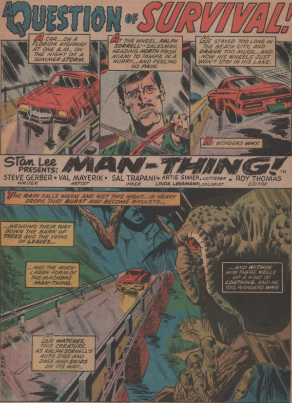 Another story of note concerning the Man-Thing, is “Night of the Laughing Dead” (issues 5 and 6 of his own volume one series). The story is pretty deep and focuses on subjects ranging from religion to parental neglect and abuse. Again, heavy subjects, but Gerber uses a Swamp Monster, hippies, and circus performers to tell this must-read story. Steve even wrote himself into a Man-Thing story (Man-Thing 22, volume 1), and it was glorious (image below)!