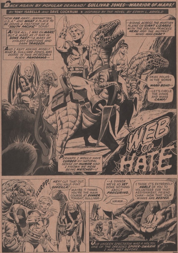 In this issue, we get an awesome interview with A.E. Van Vogt! The interview was conducted by none other than future Batman scribe, Alan Brennert! This is followed by a short one-pager (by David Anthony Kraft) talking about Otis Adelbert Kline, and his stories set on Venus (see the link about his feud with ERB). Lastly, there is a column titled “Fantastic Worlds” by Don and Maggie Thompson, that talks about all elements of sci-fi (books, shows, etc.). Now onto the stories!