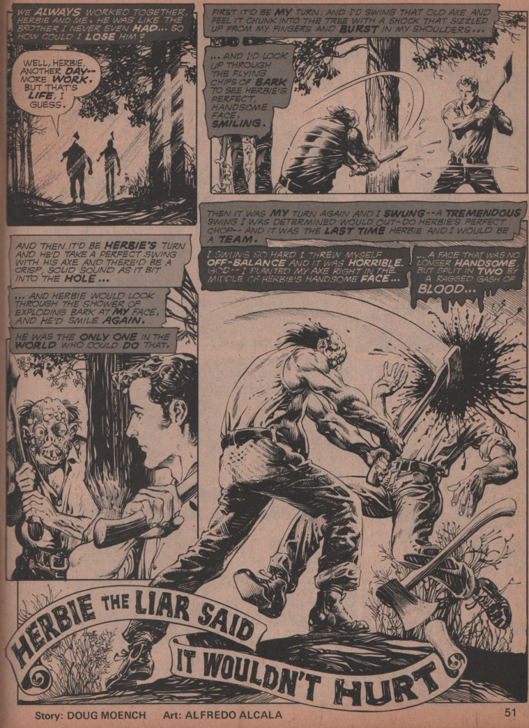 The penultimate tales is “Encounter at War.” There is a bit of a forward on the previous page stating that this one is the conclusion to a story that was started in an underground comic. It’s a good one but not anything that hasn’t been seen before. A little bit of aliens, and a little bit of treachery! Written by Jan Strnad, with art by Richard Corben!